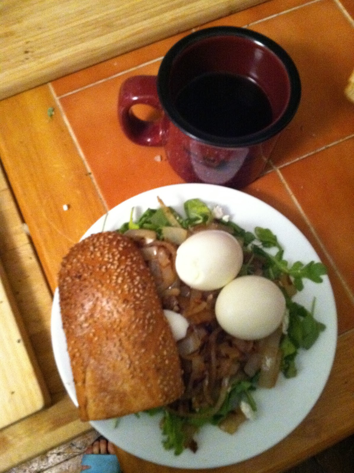 So, I sauteed garlic (a given in my fridge), beets, peppers and their greens, splashed a little balsamic over the mix, toasted the bread, spread them with goat cheese and bit of hummus and topped it with the vegetables.